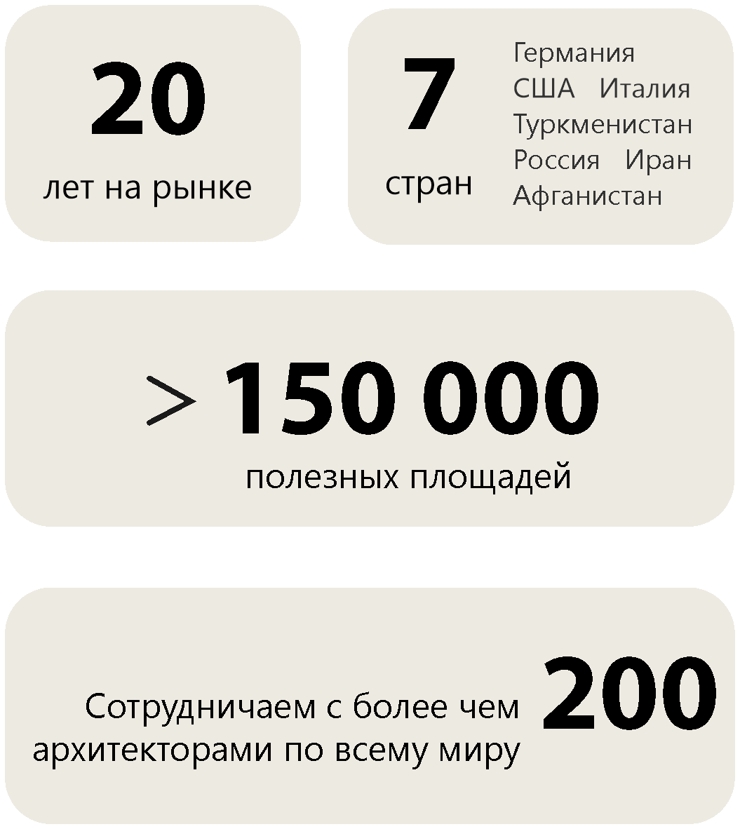 На протяжении более двух десятилетий мы прочно удерживаем позиции на международном рынке. Наши проекты успешно реализованы в семи странах, включая Германию, США, Италию, Туркменистан, Россию, Иран и Афганистан. За время нашей деятельности мы успешно построили и ввели в эксплуатацию более 150 000 квадратных метров полезных площадей. Наша команда с успехом сотрудничает с более чем 200 архитекторами со всего мира, что позволяет нам предлагать уникальные и высококачественные решения в области строительства и архитектуры.